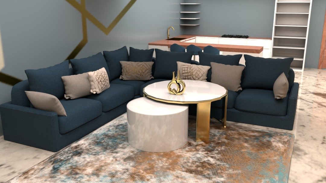 It features a large, dark blue sofa with beige and gray cushions . in front of the sofa are two round tables . A gold decorative piece on the larger table adds an artistic touch. The floor is covered with a patterned rug in shades of brown, beige , and gray , adding warmth to the room . in the background is a kitchen area with a sink , stove , and shelves , while the wall behind the sofa features a gold geometric design