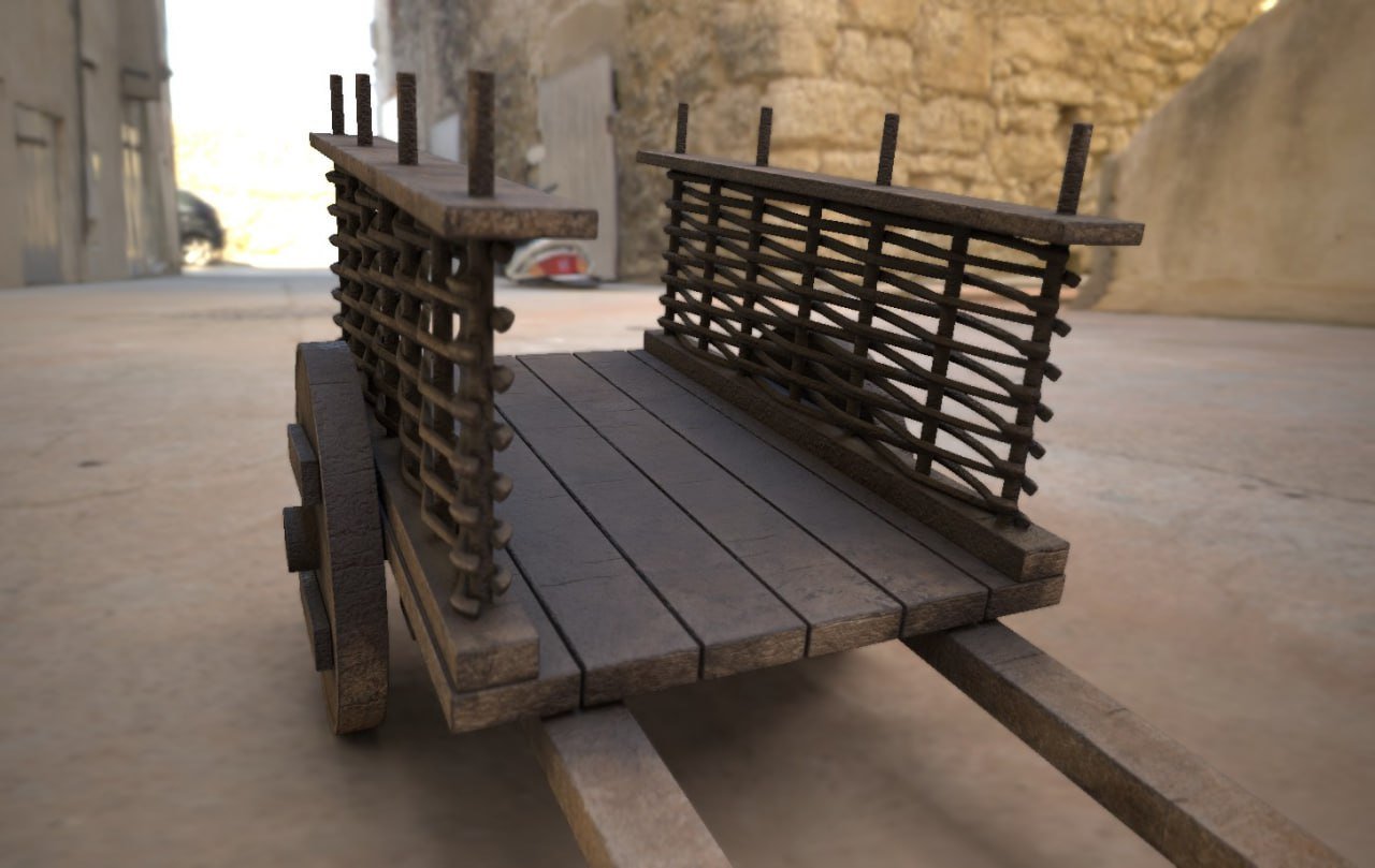 vehicle  wood it seems caring of . stone walls appear reflecting asense of antiquity . the stone is irreqular shaped which indicates that it may be part of ahistorical building or open area in natural this design was modeled using maya software with the addition of appropriate materials and lighting to achieve this wonderful scene