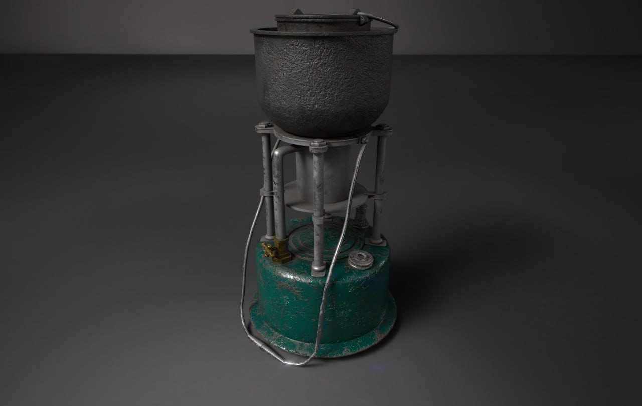 A small gas stove mounted on a green base ,The design was created using Maya software, with appropriate materials and details added to make the stove appear close to reality