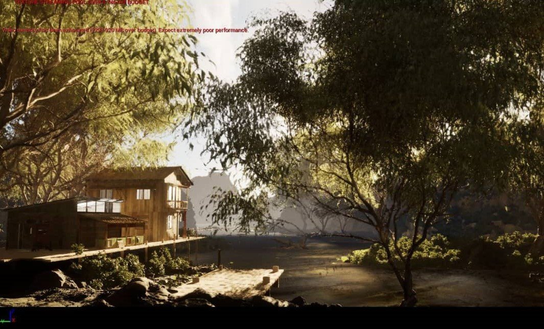 a forested area dense with trees and plants. The lighting suggests early morning or late afternoon, with sunlight filtering through the trees.